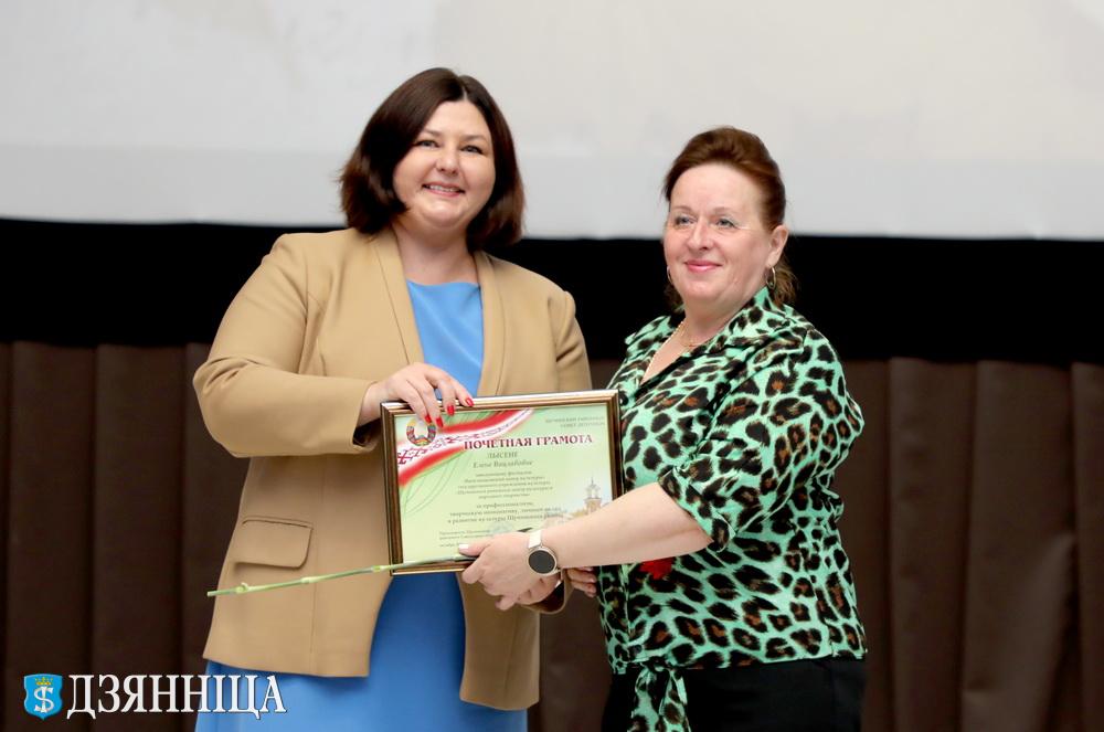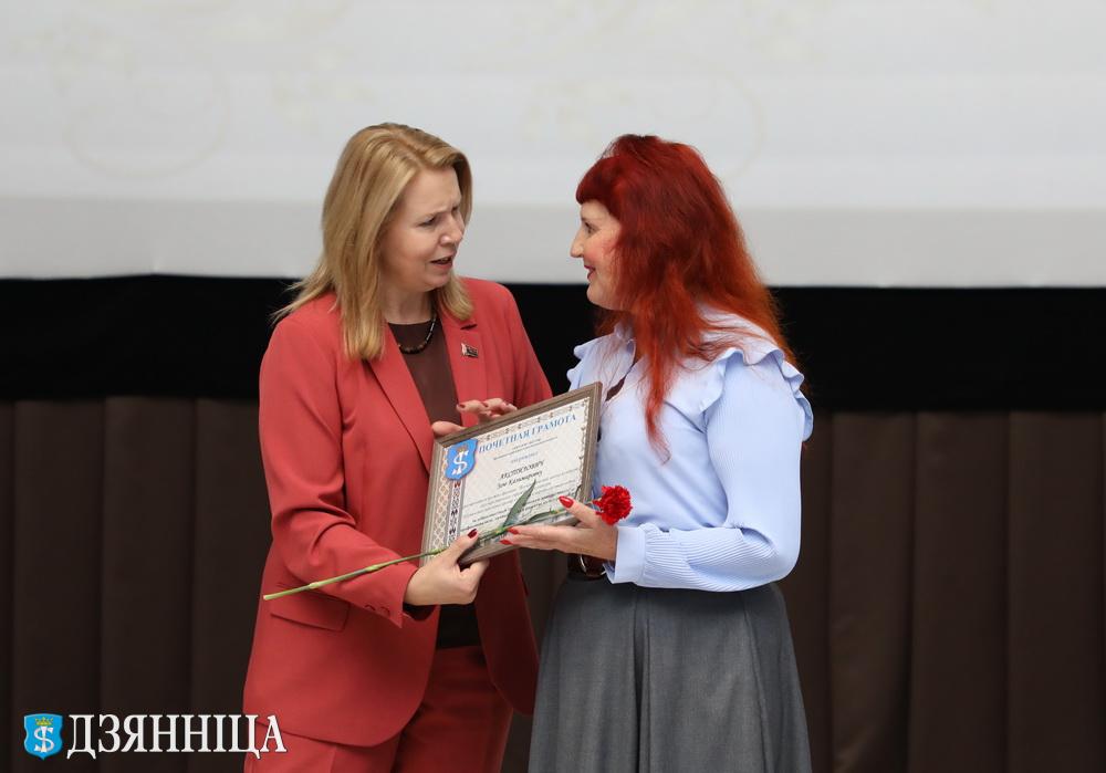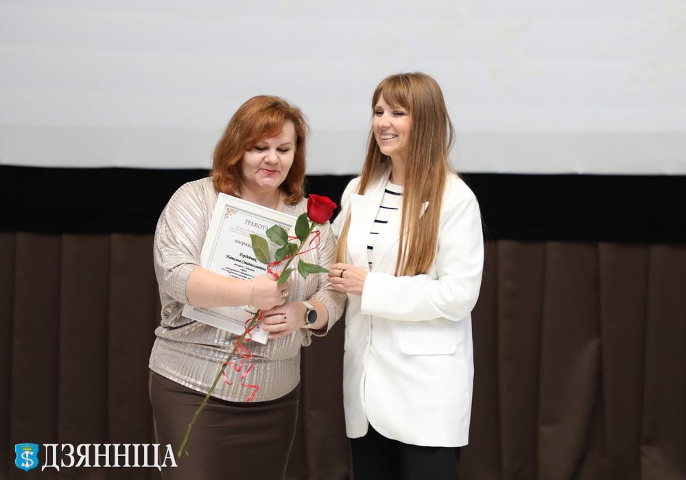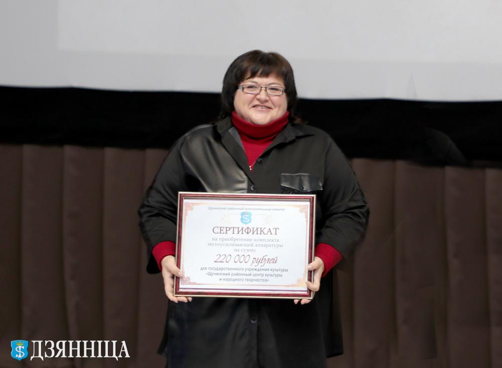 С приветственным словом к собравшимся обратилась заместитель председателя райисполкома Татьяна Тюсина. В рамках торжественной части директору Щучинского районного центра культуры и народного творчества Оксане Семыкиной был вручен сертификат на сумму 220 тысяч рублей для приобретения комплекта звукоусилительной аппаратуры. Заслуженные награды в этот день были вручены лучшим представителям отрасли. Почетной грамотой Щучинского райисполкома отмечена заведующая филиалом «Дембровский сельский Дом фольклора» Елена Олихвер. Почетной грамотой Щучинского районного Совета депутатов награждена заведующая филиалом «Василишковский центр культуры» Елена Лысеня.