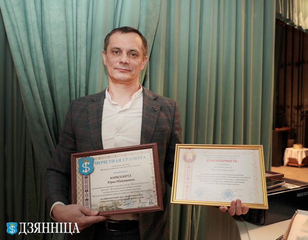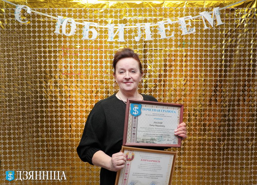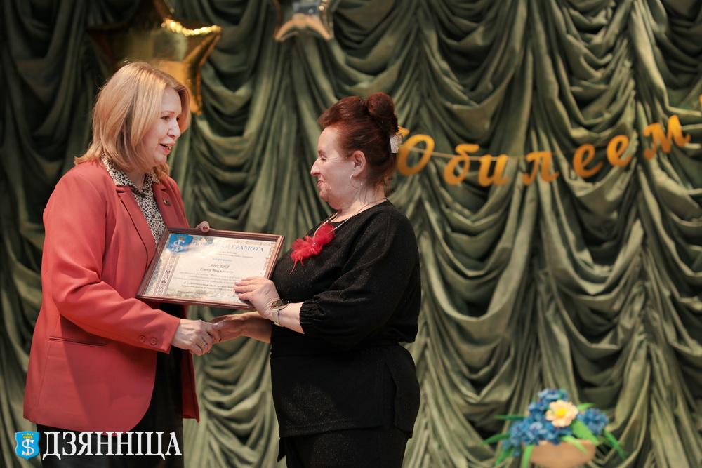 Заведующий сектором культуры райисполкома Анжела Туревич передала слова поздравления от районного Совета депутатов и районного исполнительного комитета. Руководитель вручила Благодарности райисполкома и Совета депутатов центру культуры и коллективу ансамбля, а также Почётные грамоты сектора культуры заведующему центра культуры Елене Лысене и руководителю ансамбля Юрию Борисевичу.